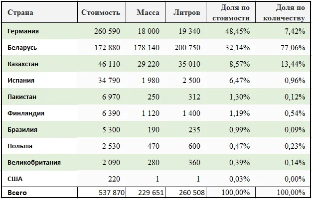 Но давайте посмотрим на статистику по странам-поставщикам, откуда ввозится этот спирт? Оборот этилового спирта, особенно через таможню, у нас довольно жёстко контролируется и даже поставки из Белоруссии и Казахстана достаточно неплохо отслеживаются, поэтому "серые схемы" завоза через Беларусь и Казахстан в данном случае не аргумент, они не очень работают. И что мы видим? Никакого Китая.