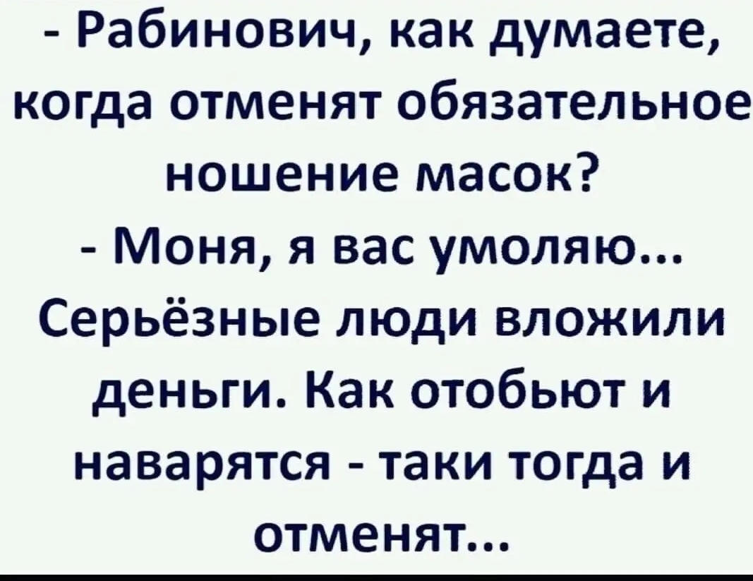 Но в любом случае, что тут важно? Мы прекрасно понимаем, что куча людей, даже имея 37,5 и боль в горле, попрутся на работу. И вот для того, чтобы общество было защищено от этих людей, мы вводим правило: всем ходить в масках. Понимаете? Мы как бы страхуем…