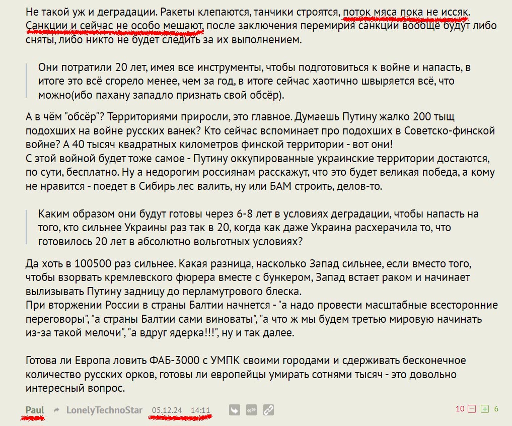 Сегодня сцепился с одним челом в дзене, так он договорился до того что Украина напала на российские регионы которые отошли к России по распоряжению ООН! Притом очень складно доказывал. Что-то бормотал про право нации на самоопределение. Представился даже каким-то юристом. Но доказывал складно. А потом в конце высказался что уничтожал бы укропов. В общем я понял с кем имею дело, с голимым ватником.