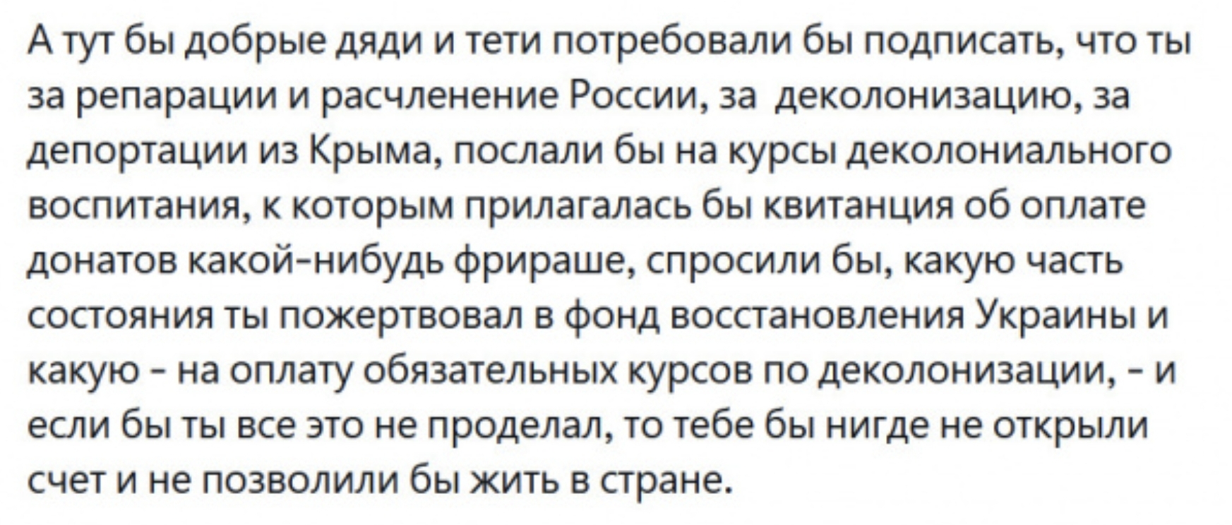 "Кстати, за репарации, расчленение Мордора, за деколонизацию, за депортации из Крыма я готов подписаться хоть сейчас".