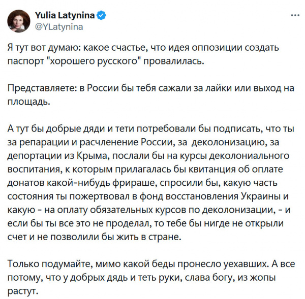 Я за набросами Латыниной в Х-сети нынче слежу из серии "чисто поржать". Мадам давно пошла в такой разнос, что даже ее дружок Арестович за ней не угонится, и наблюдать за этим - довольно забавно.