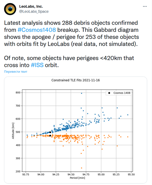 Ну вот свеженькие данные - отсюда. Картина обломков три дня спустя, перигей и апогей, часть обломков отчетливо пересекает орбиту МКС. Но снова клевещут, конечно, никак не угрожает. Кроме того, если что - увернуться же можно, правильно?