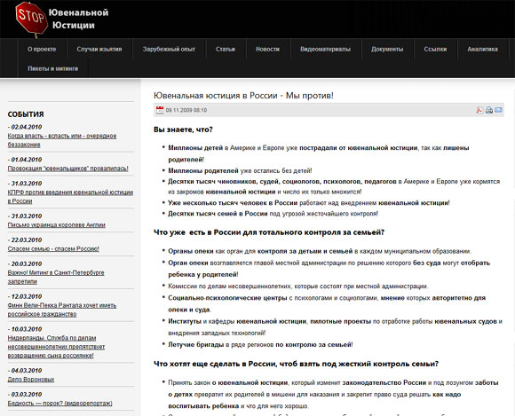 Есть сайт - "Стоп ювенальной юстиции". Он привлекает внимание людей к этой серьезнейшей проблеме. Зайдите, почитайте. Ваших детей тоже могут отобрать!