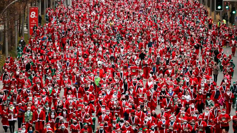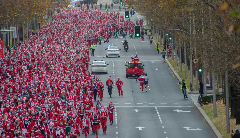 Вчера в Мадриде прошел традиционный предрождественский забег Санта-Клаусов. Это благотворительное мероприятие, которое проводится каждый год 20 декабря. Любой желающий может заплатить €12 евро и принять участие в забеге: организаторы (а организует это все крупнейшая, а точнее самая крупная в Европе сеть торговых центров El Corte Inglés) выдают зарегистрировавшимся участникам костюмы Санта-Клауса, а детям - костюмы эльфов, помощников Санты-Клауса.