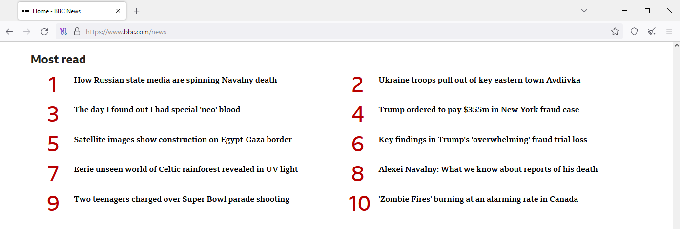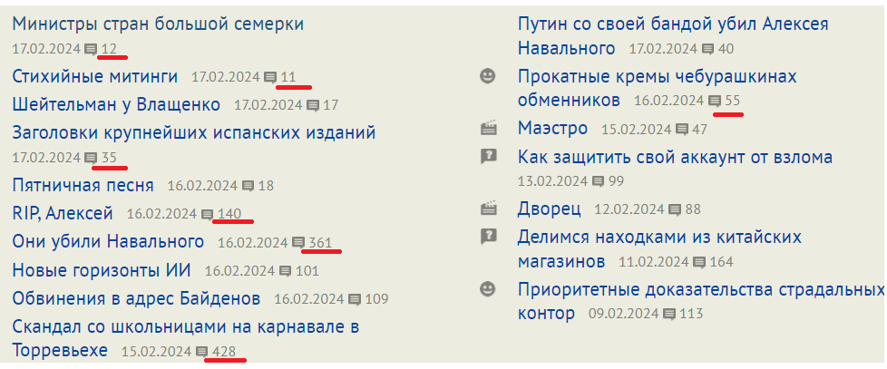 Всего на главной странице 50 заголовков. Про Навального 4, это довольно много. Про Украину только один (оставление Авдеевки).