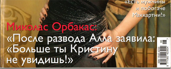Читаю интервью Орбакаса - кстати, вполне неплохое, безо всякой желтизны. Так, просто за жизнь. Так вот, в интервью ничего похожего даже рядом нет. Он только говорит о том, что после развода стал конкретно свинячить и пить, на что Пугачева ему заявила, что он тогда Кристину не увидит, раз так разгулялся - мол, нечего дочке видеть отца в таком виде. А потом, когда Миколас запропал, сама ему позвонила и спросила, почему он не звонит и не навещает дочь.