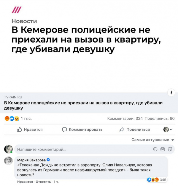 Захарова приперлась в анонс жуткой заметки на "Дожде", где рассказывалось о том, что полицейские так и не приехали по вызову в квартиру, где в течение 3 часов убивали и в конце концов убили 23-летнюю девушку, и стала кидать предъявы журналистам телеканала из-за того что они, видите ли, не встретили в аэропорту Юлию Навальную, которая о своем возвращении из Германии никого не предупреждала.