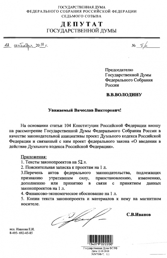 Клоун потом заявил, что внес этот проект с целью обратить внимание на то, что, типа, делом заниматься нужно, а не херней. Это по мотивам вызова на дуэль Навального было Росгвардейским начальником.