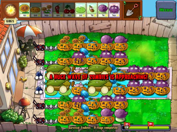 Вот эта конфигурация позволяет сдерживать потоки зомбаков сколь угодно долго. Время от времени нужно только обновлять крайние грибочки на пруду и крайние грибочки на боковых линиях - их подъедают. Ну и изредка поджираются цветочки на задних линиях, когда особо шустрый шахтер успевает прорваться и камыши его не достают. В остальном, если не забывать брать перцы и вишенки для особо сложных случаев, когда не хватает катапульт, позиция практически беспроигрышная. Все, завязал я с ней, дальше неинтересно.