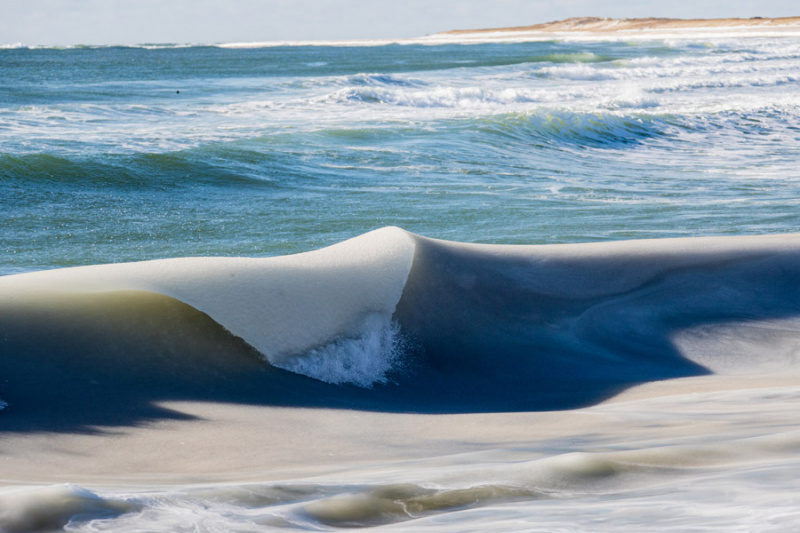 Фотограф Джонатан Нимерфрох (Jonathan Nimerfroh) находился на острове Нантакет в Массачусетсе. Джонатан занимался зимней съемкой, а потом решил завернуть на пляж. И там увидел, как волны Атлантического океана стали замерзать прямо в процессе движения. Нимерфрох сделал фотографии этого совершенно удивительного явления, и они выставлены вот в этой галерее. Посмотрите, какое чудо!