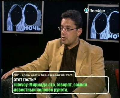 Побывал сегодня ночью в прямом эфире "Рамблер-ТВ" в передаче "Ночью можно". Вроде получилось забавно, но, впрочем, не мне судить. Заодно заглянул еще и в помещение, где сидит Lenta.ru - выглядит это все очень внушительно: огромный зал с кучей компьютеров, прокуренный до состояния обычной редакции печатного издания.