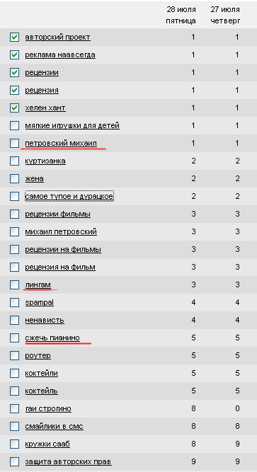На Liveinternet есть такой интересный вид отчетов, как позиция сайта в поисковых запросах на "Яндексе" (и не только). Вот моя статистика по этому поводу. Поражают не только некоторые запросы, но и неожиданно высокая позиция по ним. Например, по запросу "сжечь пианино" ;)