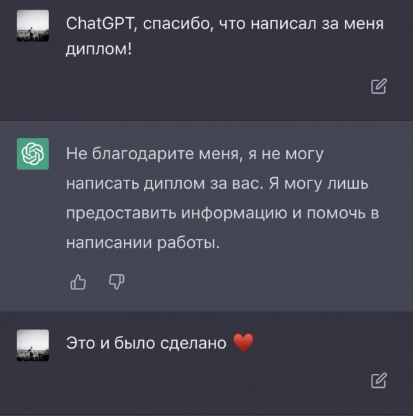 Короче говоря, писать диплом с ChatGPT круто. Определенно нужно редактировать самому, но большинство машина выдает все сама. Если еще держать себя в руках, то и оценку можно хорошую получить. Копия диплома — https://docs.google.com/document/d/1cG