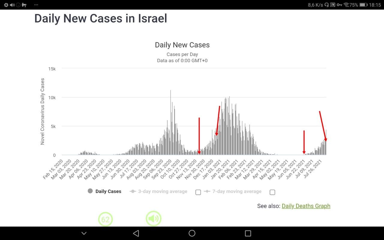 Информация по Израилю на 01.04 ( зимняя волна на излёте ) и на 05.08, когда бушует свирепая Дельта, но большАя часть населения вакцинирована и локдаун отменён:
