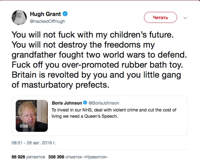 Хью Грант написал сухое вежливое письмо Борису Джонсону. Ну, в общем, там можно подписаться под каждым словом.