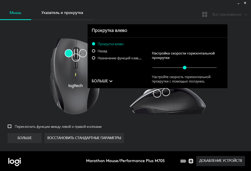 С помощью логитековского программного обеспечения назначение кнопок можно переопределять, но мне это даже и не нужно.