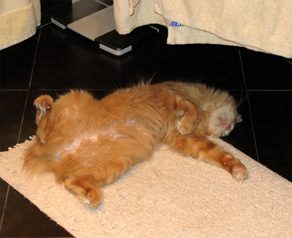 У меня в свое время кот был, у которого во время сна на диване все четыре лапы в воздухе болтались. Правда, следует признать, что случалось такое нечасто. И на полу такой фокус не проходил, кроме спины еще одна дополнительная точка опоры требовалась.