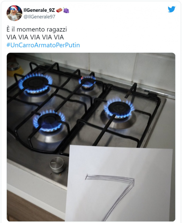 Там говорится о том, что упоротые путиноиды (а такие в Италии, безусловно, есть, как и в других странах) запустили в Твиттере хэштэг #Uncarroarmatoperputin - они призывают включить плиту на максимум, чтобы потреблять как можно больше газа. Таким образом, по "стратегии" этих упоротых, они поддержат российскую армию.