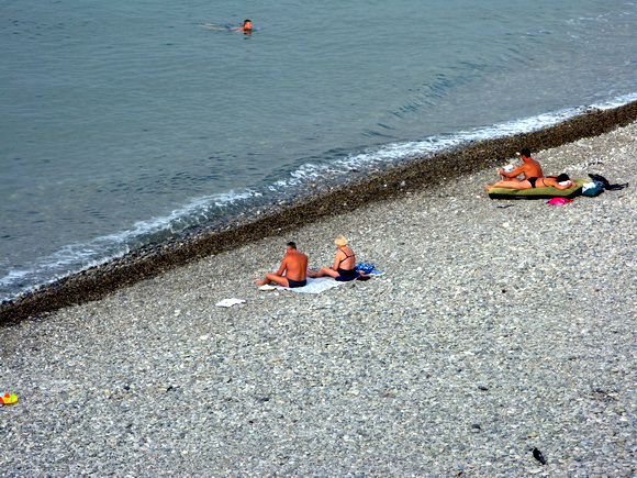 Ужасть, сплошная галька. Только в тапочках, наверно, ходить и можно, без риска повредить и отшлифовать ступни. Толи дело у нас, во Владике - горячий песочек на пляжах, как в каких-нибудь Турциях да Египтах и целый прохладный Тихий окиян! Это вам не загаженная лужица по имени Чёрное море. [показывает язык]