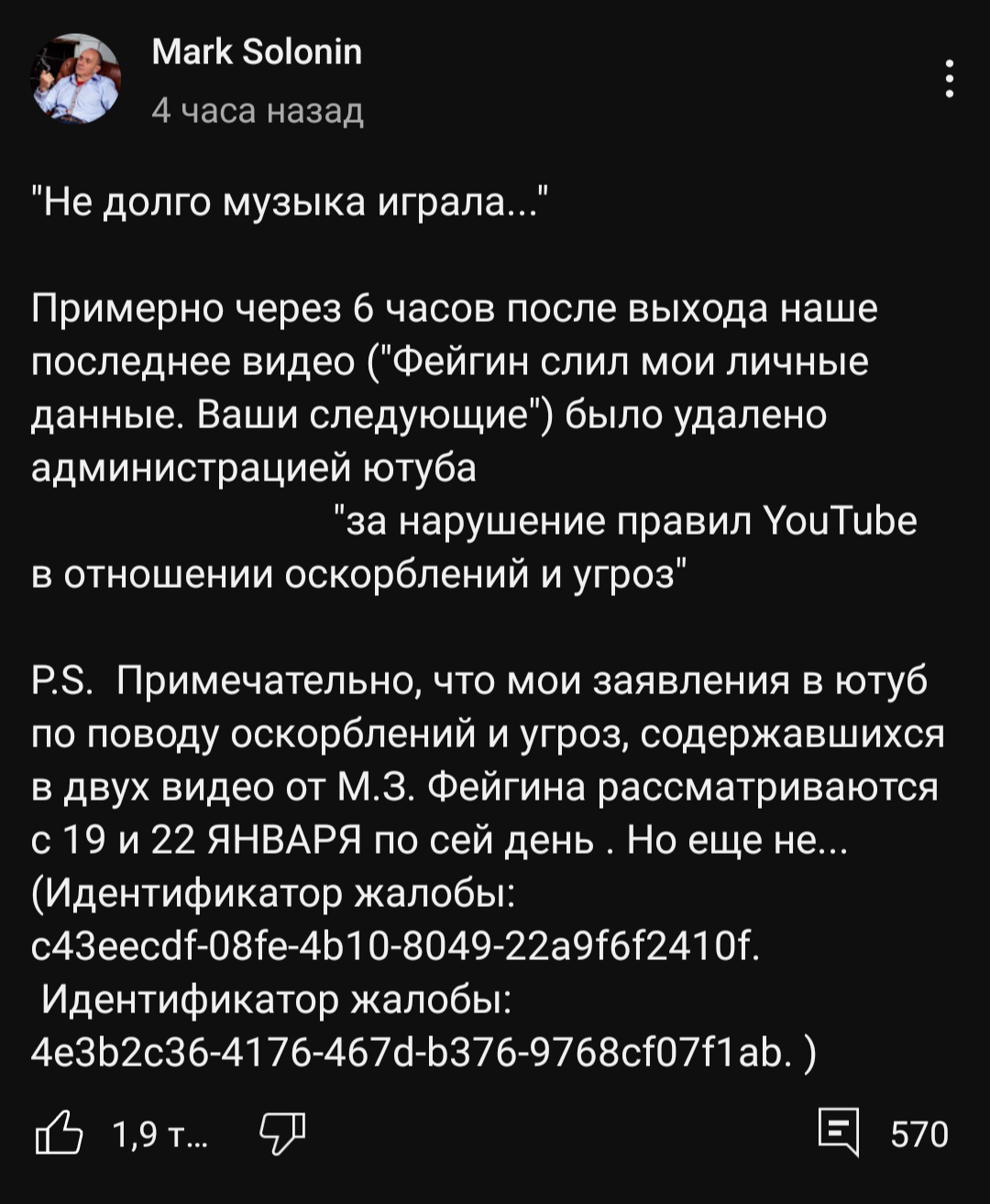Хорошо, что успел вчера посмотреть. Марка Семеновича можно понять. Хряк Фейгин совсем потерял берега, например, угрожая безопасности дочери Солонина, которая, как я понял, зачем-то осталась в Куйбышеве. Думал, что видео удалил сам Youtube по жалобе хряка или же за демонстрацию в кадре персональных данных и своих, и своих родственников. Таких консерв из рашки - больше половины. Многие начинают вскрываться на своей органической антипатии к Бабченко, Солонину и отчасти к Невзорову