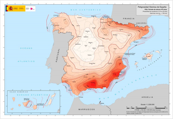 Начнем с того, что самые сейсмически опасные территории в Испании - это юг автономии Валенсия, район "Вега Баха", Мурсия и далее вглубь материка по направлению к Гранаде до Малаги (см. карту). Еще Пиринейские горы и Канары, но в меньшей степени.
