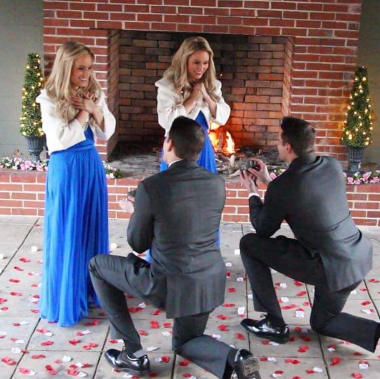 Братья сделали предложение в один и тот же день, пары поженились в один и тот же день, причем невесты были в одинаковых платьях, и они вчетвером поселились в одном доме.
