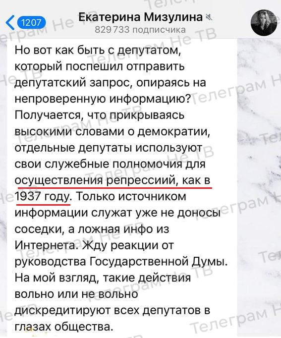 А как быть с депутатом, дискредитирующим 37 год и лично товарища Сталина? Ведь как недавно стало известно, никаких репрессий не было, а была совершенно законная работа по выявлению врагов народа и иностранных шпионов доблестными НВКДшниками. Опасные рассуждения у Мизулиной, на чью мельницу воду льёт?