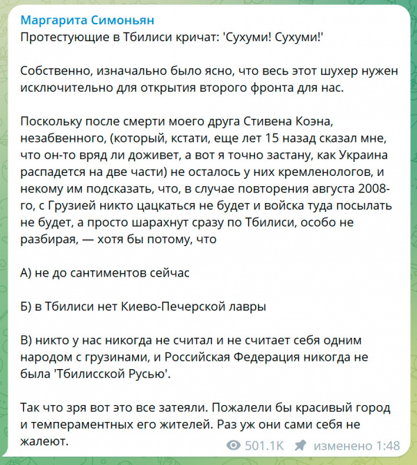 Понимаем мы все что рот Маргариты штука не независимая. Думаю это такая своеобразная помощь грузинской правящей партии, хорошему другу Бидзине. Обращение к протестующим. "Вы что, хотите как в П̶а̶р̶и̶ж̶е̶ Киеве?". Это не железная логика Симонян, это скорее угроза Кремля.