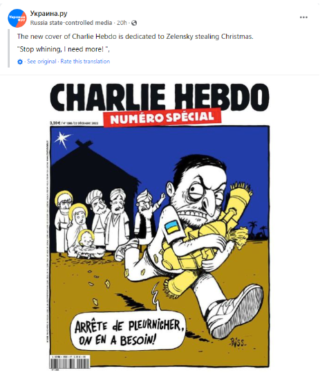 "Neither the “Charlie Hebdo” website nor the Twitter and Facebook pages of the magazine feature a similar cover of Zelenskyy. "