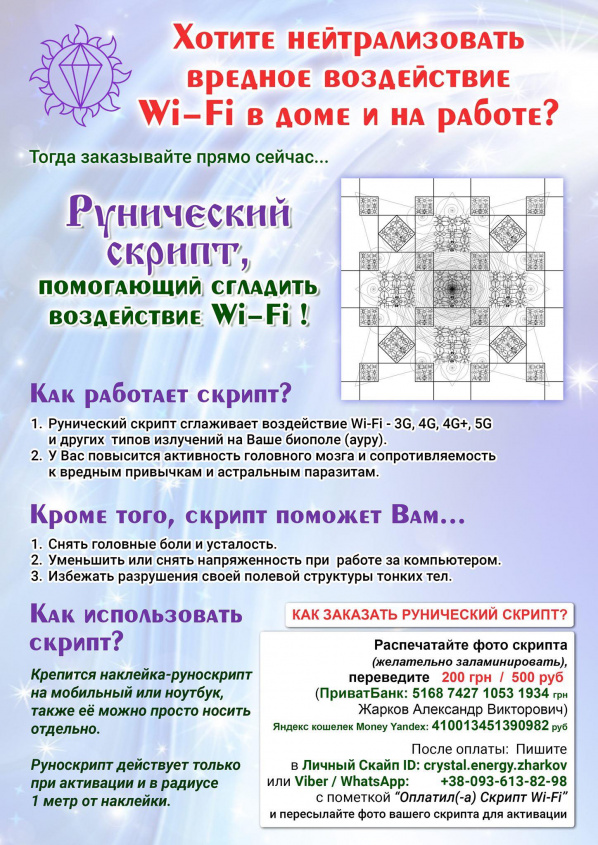 Но, с сожалением, должен констатировать тот факт, что жулик нынче совсем тупой пошел. Он же волшебный рунический скрипт изобразил прямо на рекламке! Я его вырезал, наклеил на картон, разместил на роутере, стоящем рядом на столе, измерил результаты - и точно! Wi-Fi стал заметно более сглаженный! У моего мозга повысилась активность! Я перестал выпивать до 11 утра! Усталость в 9 утра не наблюдалась совершенно! Никакой напряженности при работе за компьютером я не почувствовал - ну, разве что кроме седалищной мышцы. Полевая структура моих тонких тел стала поразительно целостной. И заметьте, что я при этом не заплатил заслуженному изобретателю ни копейки! Ну как же он мог так проколоться, как?!! Он тупой, наверное. У гениальных изобретателей такое встречается.