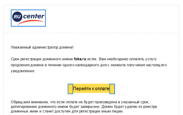 По ссылке "Перейти к оплате" открывается форма оплаты Яндекс.Денег с номером кошелька жулика. Причем еще и очень жадного жулика, потому что 4110 за продление домена - тут даже до тупого дойдет, что это развод.