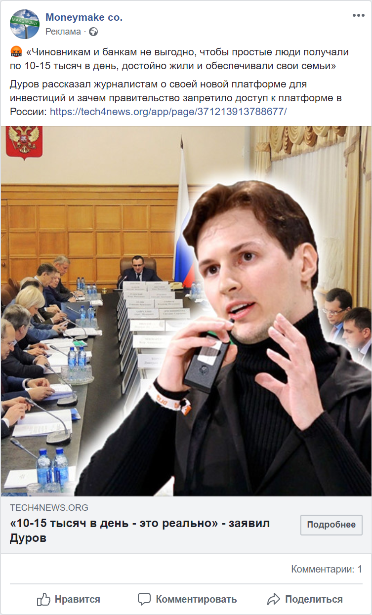 Фейсбук в плане мошеннической рекламы впереди планеты всей. Такого количества лохотронов я на своем веку не видел даже в лихие девяностые. И масса заманух от имени известных людей - Нагиева, Урганта, Павла Дурова и т.д. Такое впечатление, что заявки на рекламу не модерируются вовсе.