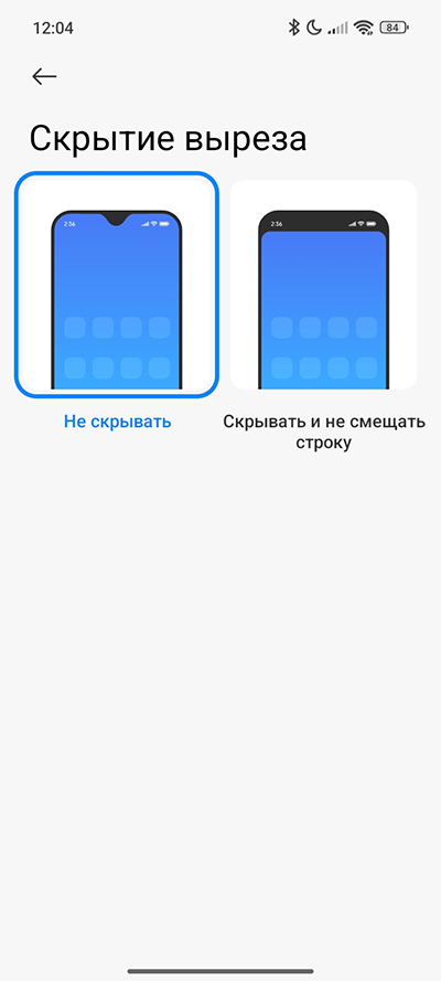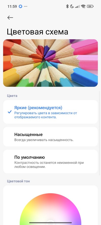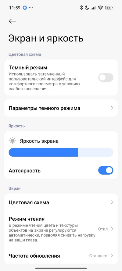 Настройки дисплея - стандартные для HyperOS. Есть темный режим и режим чтения, который можно включать по расписанию. Настраиваются цветовая схема и размер текста. Вырез можно скрывать - в том числе и в отдельных приложениях.