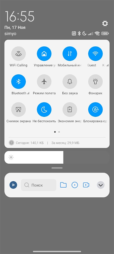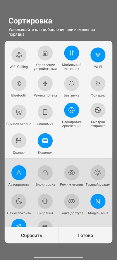 Область быстрых переключателей и их настройка.