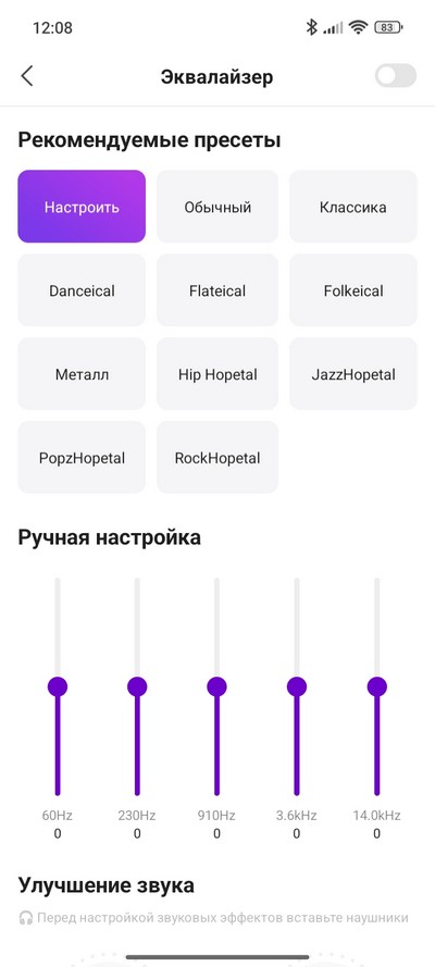 Как обычно, есть настройки под разные типы наушников, звуковые эффекты.