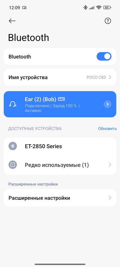Для проверки беспроводного звучания подключил наушники Nothing Ear (2). Наушники подключились по кодеку AAC.