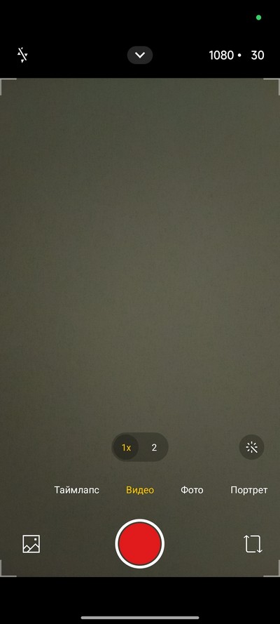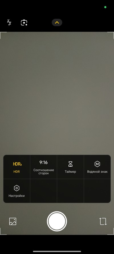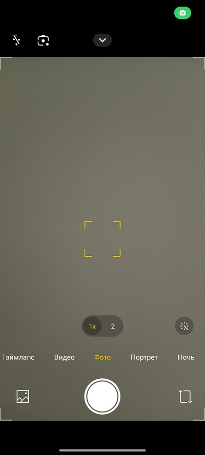 Интерфейс камеры. Снизу переключаются режимы, выше переключение между обычной съемкой и двухкратным цифровым зумом. Сверху - пиктограммы некоторых настроек и шеврон, по которому открывается дополнительное меню.