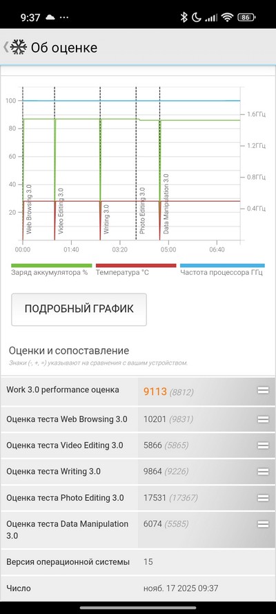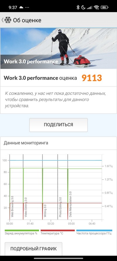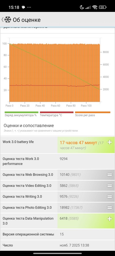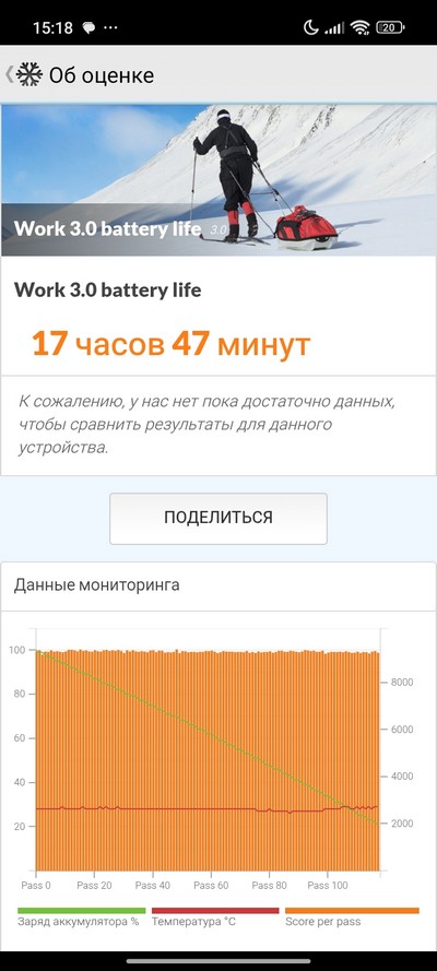 Синтетический тест PCMark. Отличный показатель, смартфон очень экономно расходует энергию.