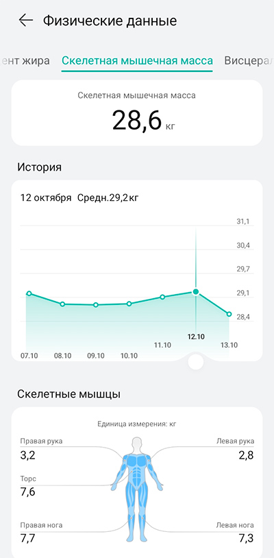 • Скелетные мышцы: 28,6 кг (6,9 кг/м²) — довольно хороший показатель для поддержания метаболизма и физической формы.