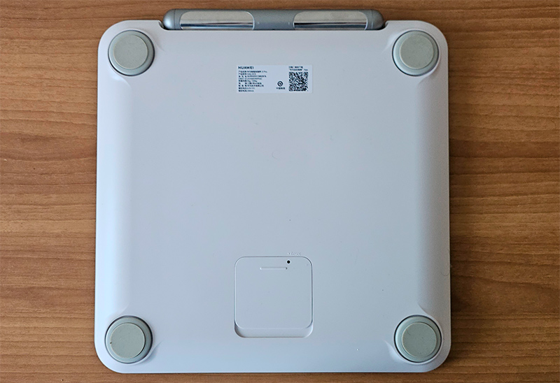 На нижней крышке весов, выполненной из матового пластика,  находятся пластиковые ножки с силиконовыми насадками, имеющие определенную степень свободы, позволяющей весам устойчиво стоять на поверхности и не скользить. Там же располагается отсек для батареек. Трех батареек ААА при ежедневном измерении должно хватать примерно на год.