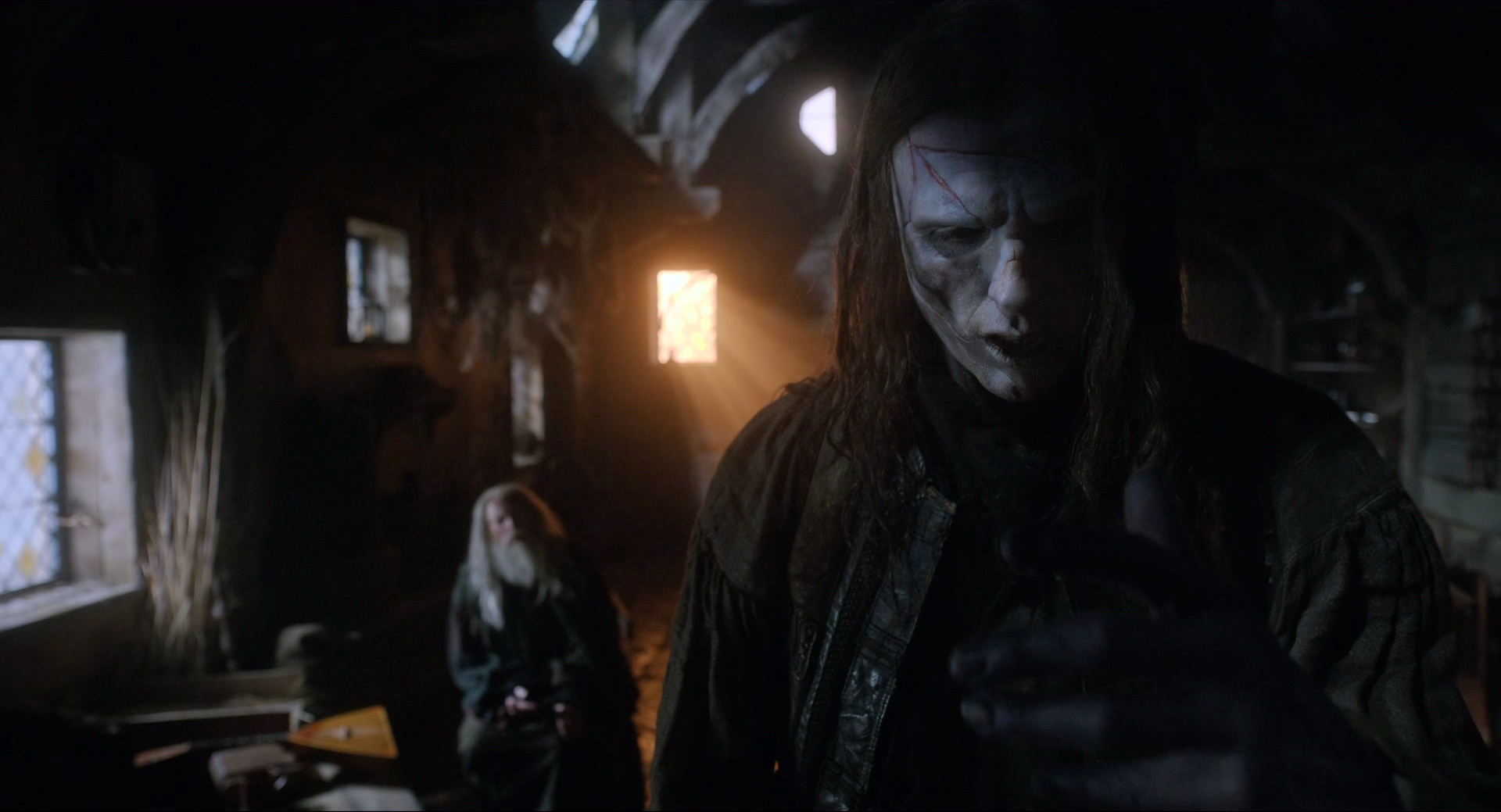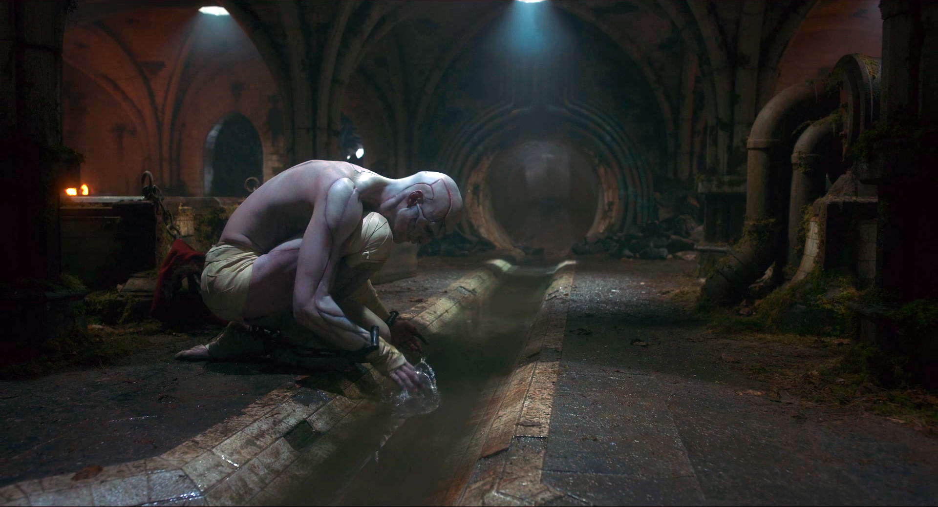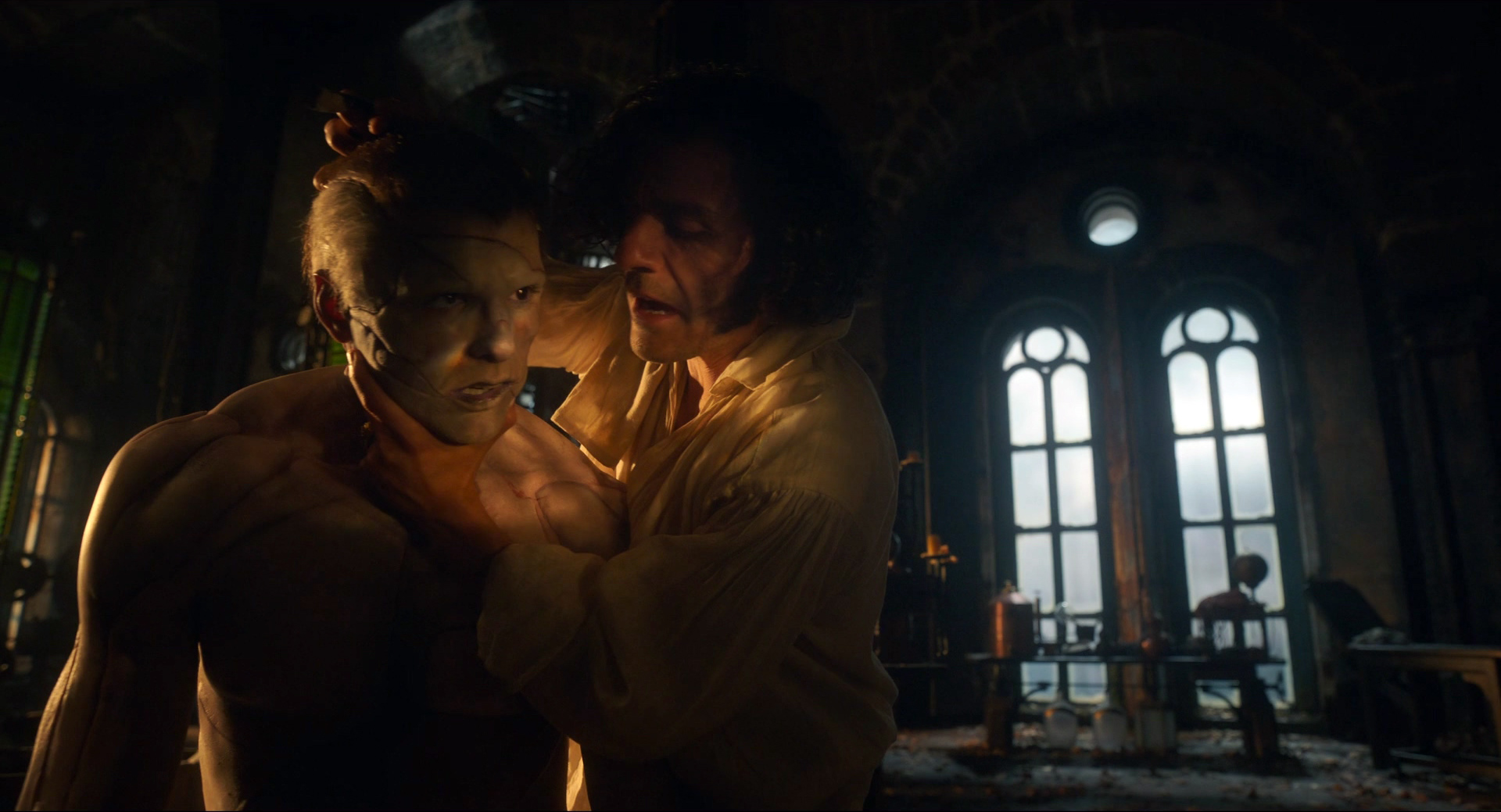 И там с точки зрения грима и постановки было интересное решение: первоначально Существо выглядит пугающе, его лицо и тело сшито из разных кусков, оно двигается как какой-то кадавр (я читал, что Элорди для движений Существа использовал элементы японского танца буто), но позже, когда Существо проходит определенный путь развития, на его лице постепенно проявляются человеческие черты.