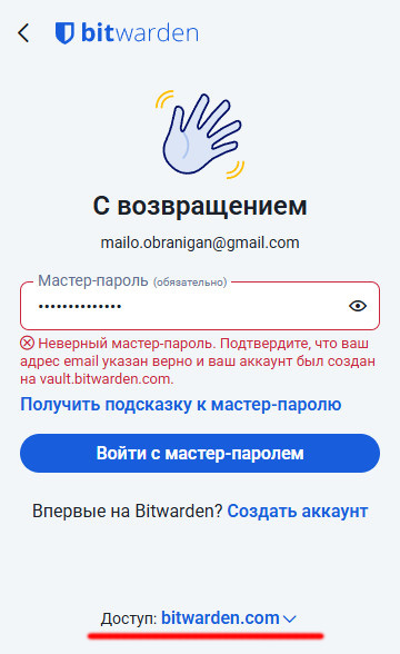 Так что если вы при регистрации выбрали европейские серверы, в разделе "Доступ" выберите "bitwarden.eu" (плагин это запомнит) и вводите мастер-пароль.
