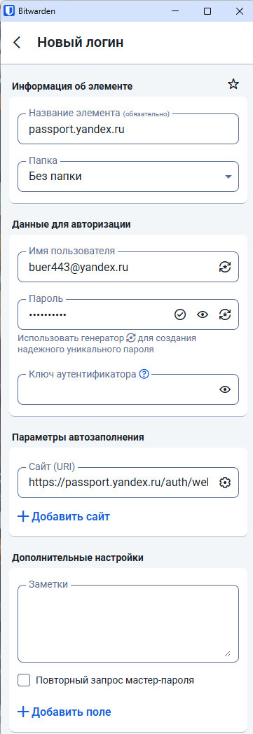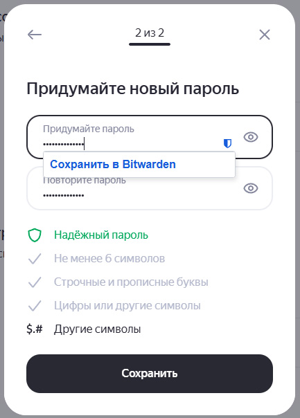 После этого два раза копируете его в форму нового пароля и щелкаете по ссылке "Сохранить в Bitwarden" и по кнопке "Сохранить" формы нового пароля - в Bitwarden будет сохранен новый пароль.