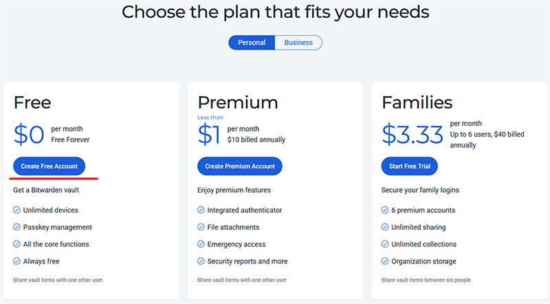 Чтобы начать пользоваться Bitwarden, нужно нажать кнопку "Get Started Free". В появившемся окне нажать на закладку "Personal", чтобы получить персональные тарифные планы (по умолчанию там активирована закладка "Business"), и там выбрать тарифный план Free, где нужно нажать "Create Free Account".