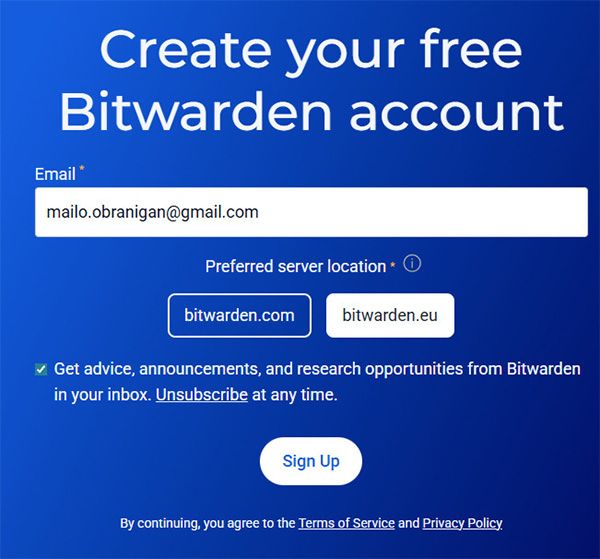 Создание нового бесплатного аккаунта. Там нужно ввести какой-то ваш e-mail, к которому всегда будет доступ, также можно выбрать серверы, где будут храниться ваши данные - американские или европейские, и можно отметить опцию, чтобы Bitwarden слал вам советы по его использованию (на английском).